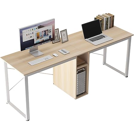 amazon com homcom 88 extra long 2 person computer desk with storage shelves combo double workstation storage study writing table for home office bookshelf natural wood color home kitchen