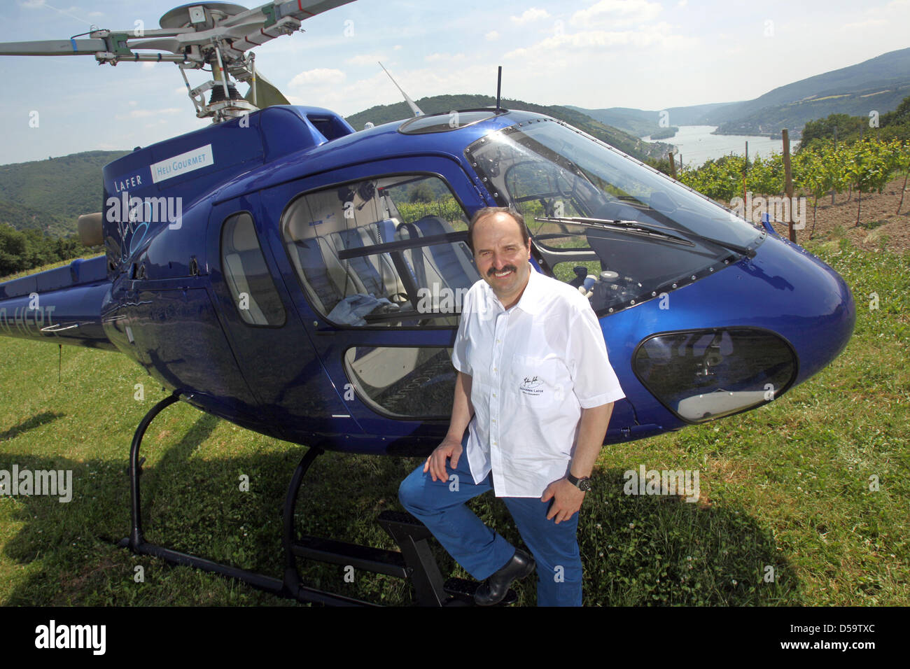 the gourmet chef johann lafer m stands before his helicopter which he uses to fly guests to a gourmet picknick on a romantic rock projection in the area of bingen germany on 27 june