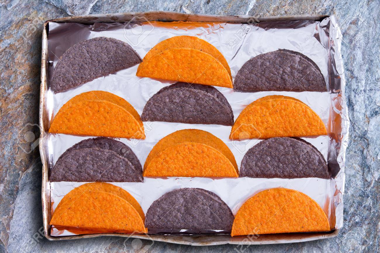 crunchy tortillas ein traditionelles fladenbrot mit maismehl oder mais in lateinamerikanische kuche popular gemacht die darauf warten in der in einem alternierenden muster colorfu in einem backblech angeordnet ofen erhitzt werden lizenzfreie