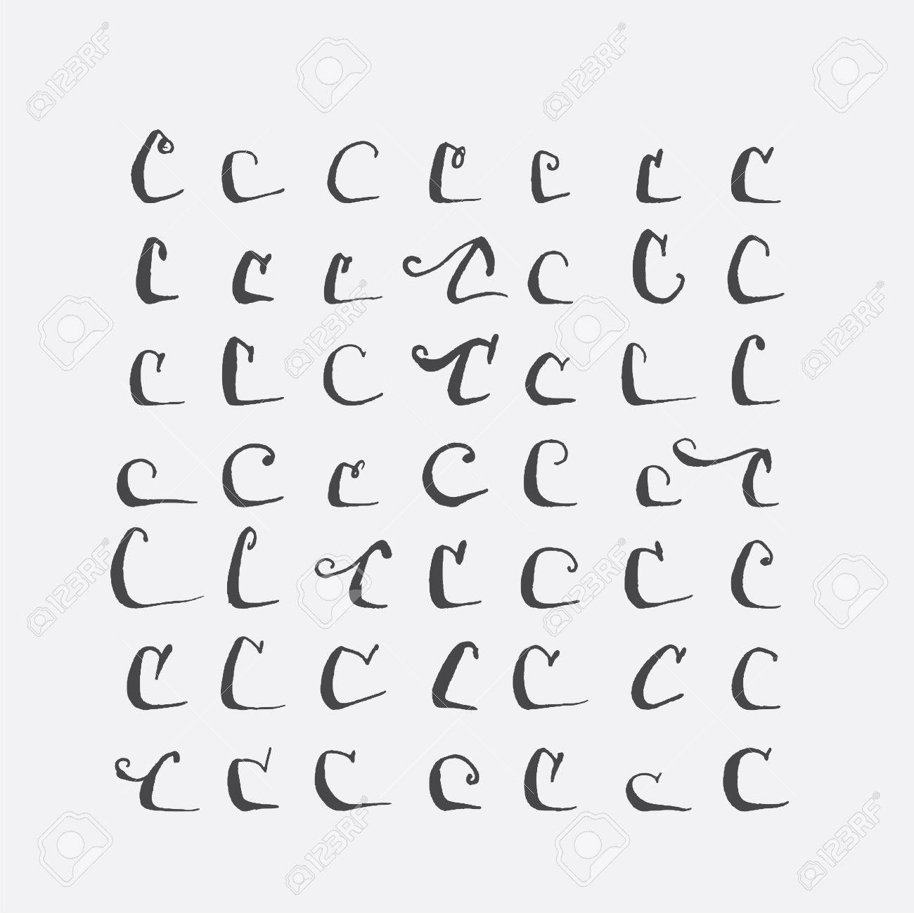 vector reihe von kalligraphischen buchstaben c handschriftlich mit spitzer feder verziert mit schnorkel und dekorativen elementen isoliert auf grau schwarz unvollkommenen buchstaben sequenz verschiedene formen sammlung lizenzfrei nutzbare