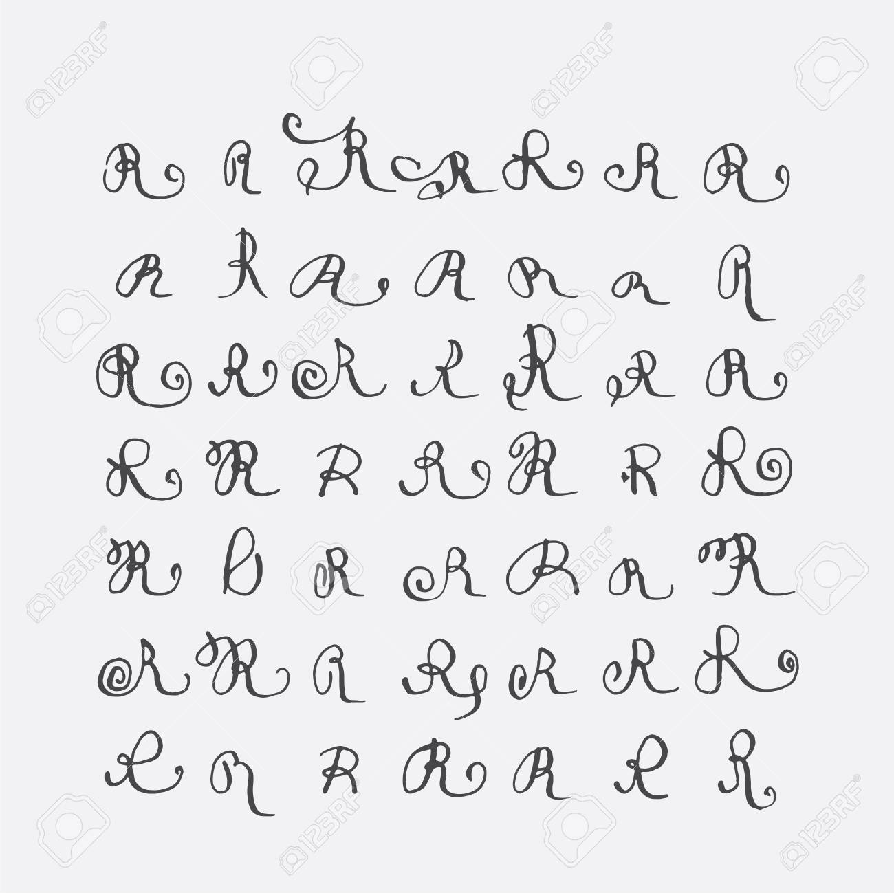 vector reihe von kalligraphischen buchstaben r handschriftlich mit spitzer feder verziert mit schnorkel und dekorativen elementen isoliert auf grau schwarz unvollkommenen buchstaben sequenz verschiedene formen sammlung lizenzfrei nutzbare